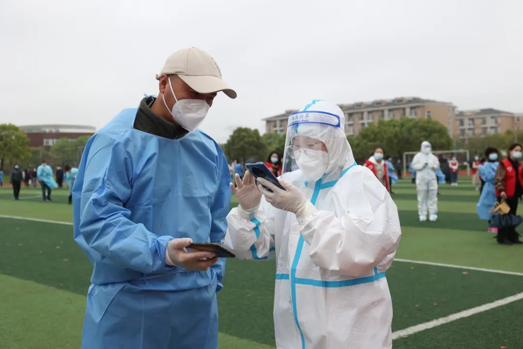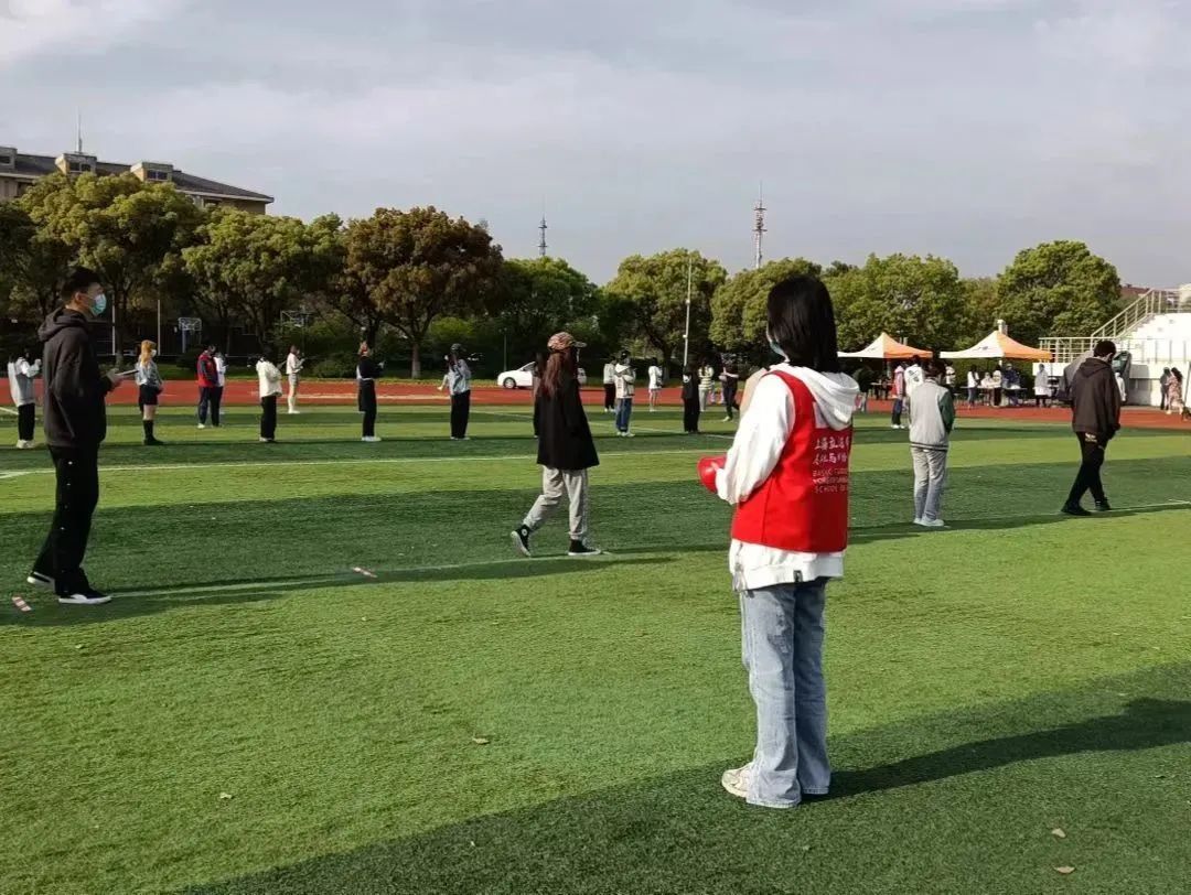 绿茵场上,身穿“大白”的师生站在队首,熟练地拿起拭子俯身为大家进行咽拭子采样。负责维持秩序的“红马甲”,分散在队伍的各处,提醒大家生成核酸码、保持两米安全距离,并引导采样完毕的师生有序离开。