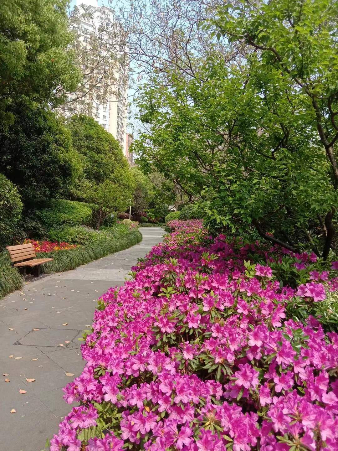 这些天,蓬莱公园的杜鹃花开得正艳,令人心旷神怡。蓬莱公园的杜鹃花共计约800平方米,以红色为主,部分粉色和少量白色点缀其中。主要分布在公园主干道两侧、儿童乐园前、三号门花境、景墙周边及茶室周边等地方,开得花团锦簇,好不热闹。