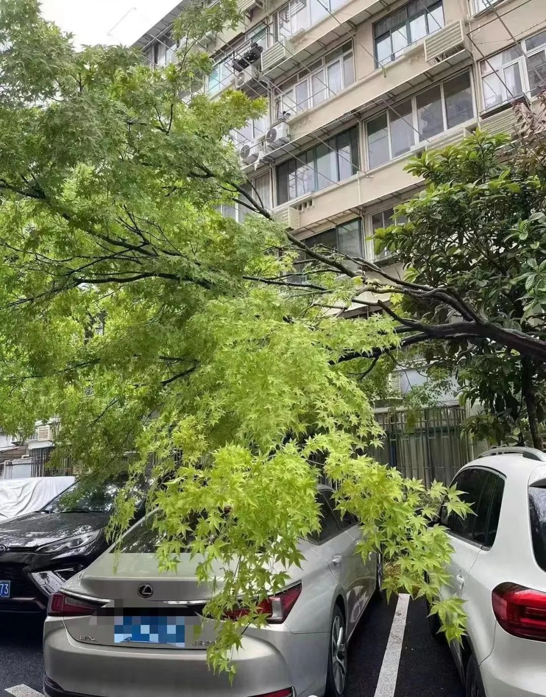 抢险人员在现场看到,一棵直径约碗口粗细的青枫,其中较大的一枝树冠因雨后受力加重而垂了下来,一旦树枝承受不住力量而折断,坠落砸到停靠在树下的车辆时,便会对车辆造成损坏。