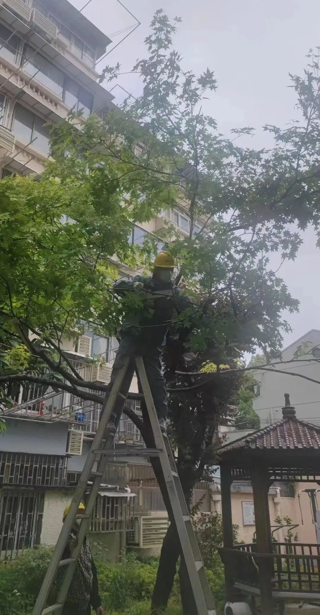 应急抢险队员立即架起长梯,用修剪工具对青枫进行疏枝处理,以减轻树冠的承重,经过1个小时紧张而有序的忙碌工作,顺利消除了安全隐患。