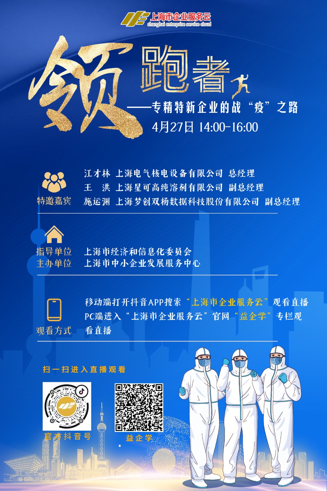 4月27日(周三)下午14点,敬请关注上海市企业服务云《领跑者》栏目直播间!本期节目特别邀请三家专精特新企业管理者做客直播间,讲述专精特新企业在疫情期间稳定生产、参与抗疫、关怀员工等方面的经验和做法,帮助更多企业坚定信心、恢复发展,共同渡过难关。