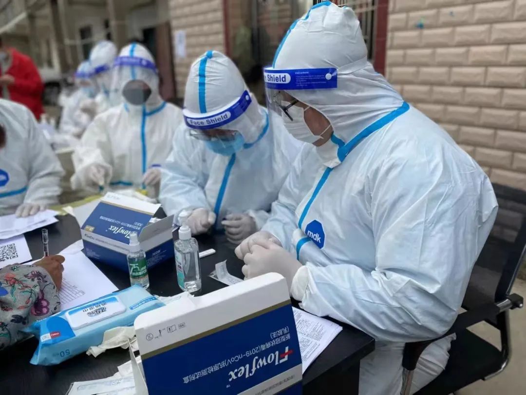 3月26日上午10点,奉金分公司肖塘党支部收到共建单位五宅村村委求助,急需志愿者,支部16名党员全部加入新的“战疫”行动中。520多户人家3300多位村民,消毒、讲解、测试、登记、确认、上传……“蓝精灵”们忙得一刻不停,协助完成抗原检测800人。