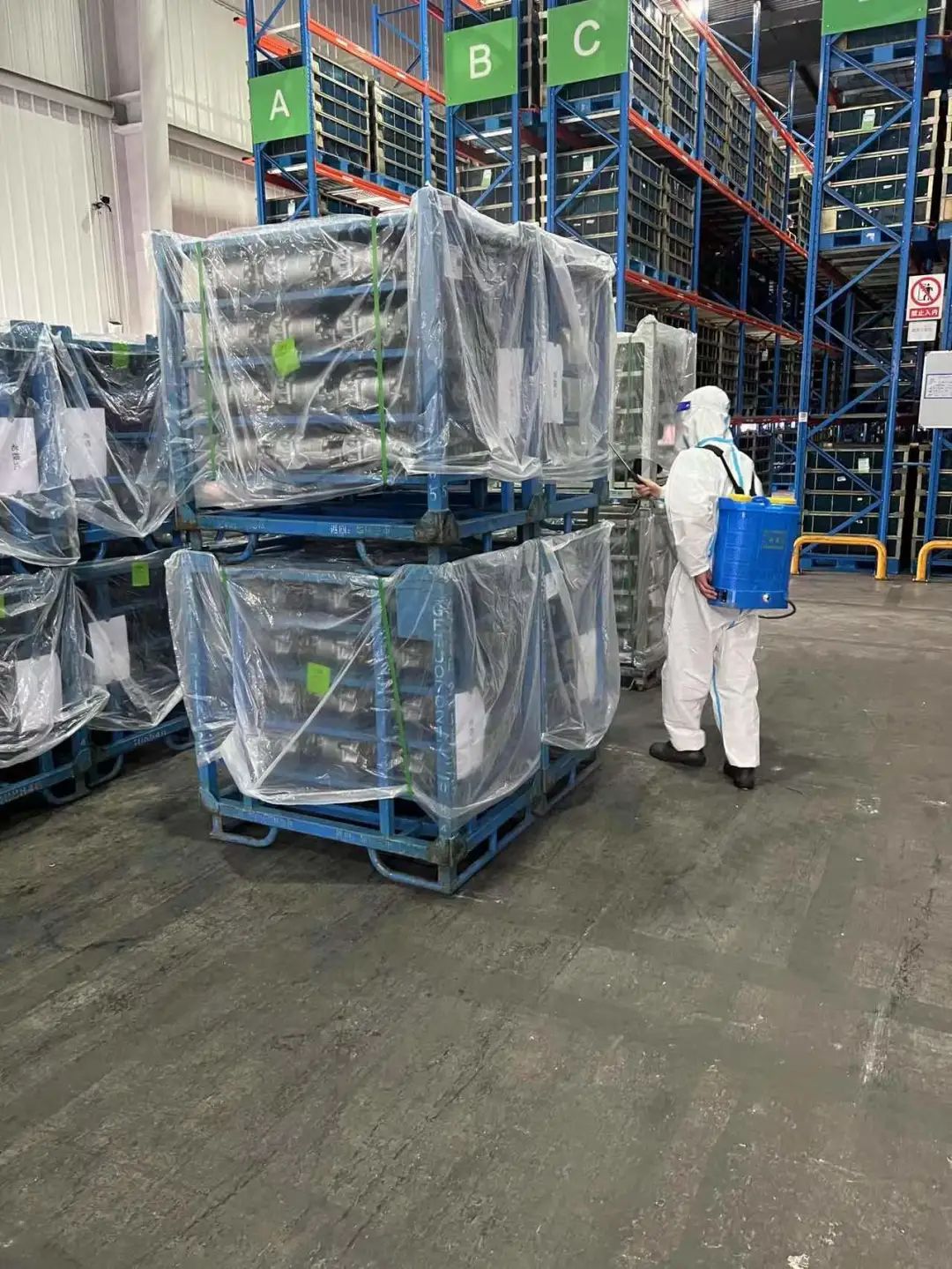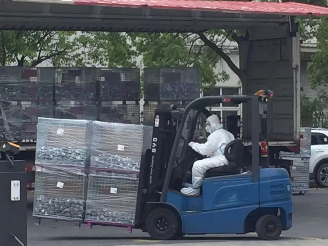 在位于苏州市相城区的苏州星华实业有限公司的工厂内,一辆大型卡车停在工厂库房,工作人员正往车上装运各种货物。这一天内,有许多小型货车也分别驶入厂内,工作人员把小车上的货物清点后装至大卡车上。全部装载完毕后,大车将货物运输至物流公司,在外市的中转站进行集中消杀,随后立刻启程前往上海三立汇众。