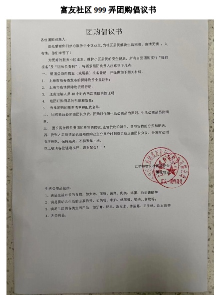 为了严格落实相关小区封闭管理制度,在拔点工作组指导下,富友社区在社区团购和防疫安全之间积极寻求平衡点,重新建立居委和居民的信任感。在居委会、物业、下沉党员突击队、群众志愿者、热心居民等多方协同下,大家一起分析团购物资的薄弱环节,研究疫情风险点,共同制定《富友社区团购流程》《社区团购报备登记表》,进一步规范社区团购。