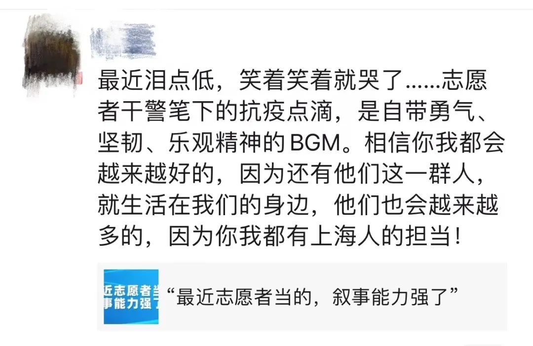 当时我们小区志愿者里有两个人混采出现了异常(后来证实是虚惊一场)。再做核酸的时候,陶主任拿着宽胶带仔仔细细给我们每个志愿者绑手套、贴封口,一边贴一边带着哭腔“要把你们保护好,你们阳了,我们就塌了”。有居民之前跟志愿者接触过,也有些恐慌,场面就有点乱。陶主任说,我这几天抗原、核酸都是阴,我天天跟志愿者在一起,要阳也是我先阳!场面立刻就稳住了,关键时刻就是需要一个人站出来,她就是那个人。