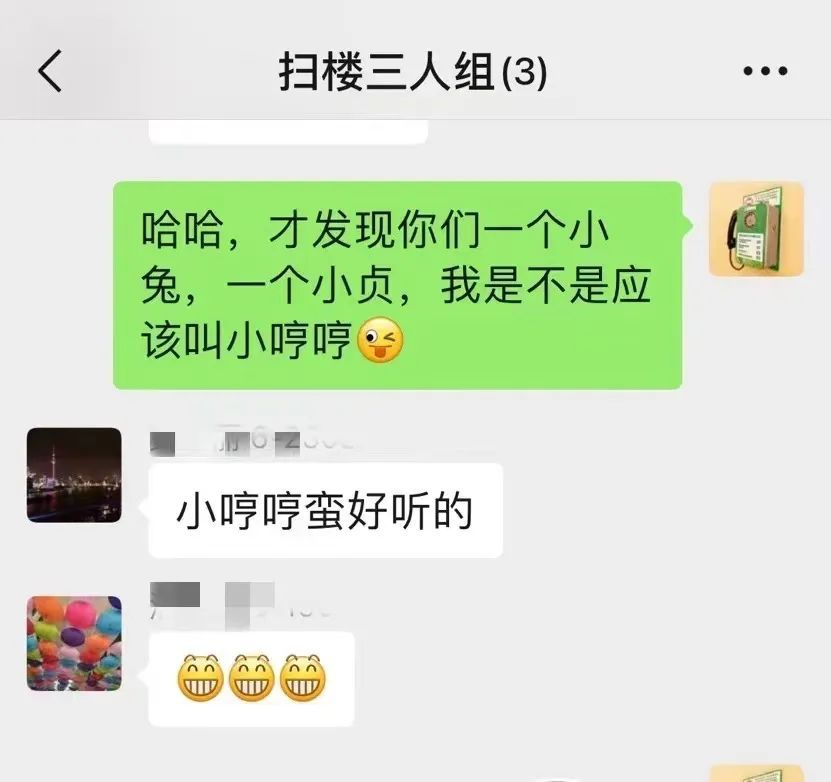 贞贞和兔兔俩人是我们楼的楼组长,做楼道志愿者的时候,我就是跟着她俩混。