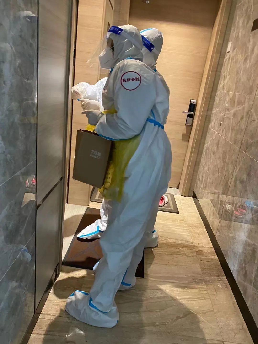 扫楼的时候还发生了很多笑话。我们一直以为楼道里是声控灯,是因为我们穿了大白服,拍手、跺脚不够响,所以灯才不亮。所以每次起早贪黑的时候,三个人轮流,拼命跺脚、拍手,来回多次才发现是感应灯。想象三个人在昏暗的楼道里,用尽全力又跺脚又拍手的样子,不知道的以为这仨在楼道里要表演什么新奇的节目。