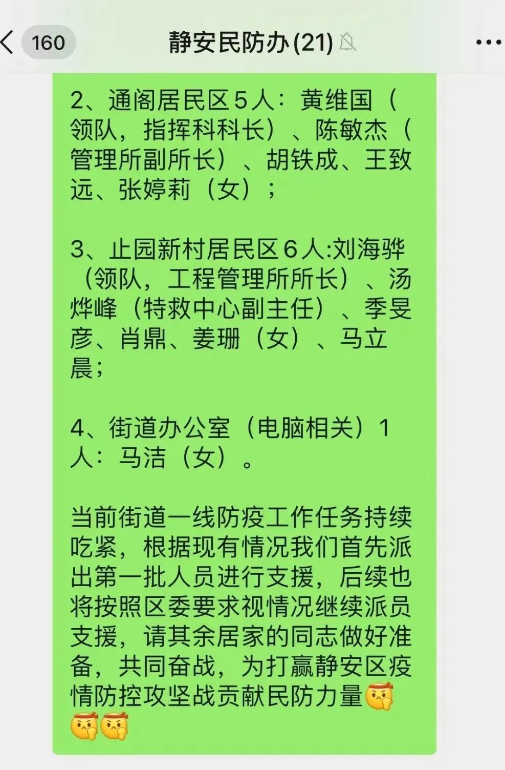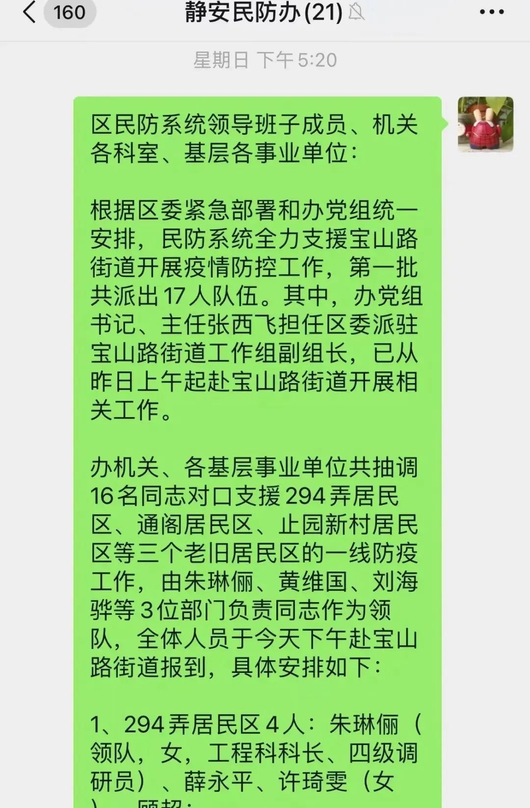 4月24日,静安区民防办党组紧急抽调办机关、各基层事业单位16名同志,迅速组建民防办第一批支援宝山路街道抗疫工作组。工作组下设294弄居民区、通阁居民区、止园新村居民区等三个小组,对口支援三个老旧居民区的一线防疫工作。当天下午,16人支援队伍迅速集结完毕,第一时间赶赴对口居民区报到,助力宝山路街道和对口居民区完成核酸检测、物资搬运、人员转运、数据统计等一线防疫工作。