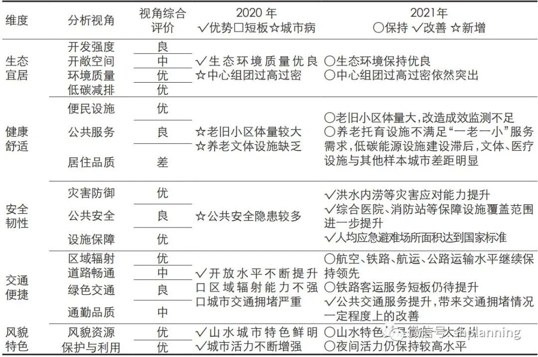 在各项客观评价结果基础上,将主观评价指标对照查找短板和不足。以重庆市为例,重庆市本着“大病大治,小病小治”的原则,将二级指标分为“优、良、中、差”4个等级;并对于每个一级指标按照优势、短板、城市病等分类阐述,同时根据上一年度的变化情况做出调整说明。