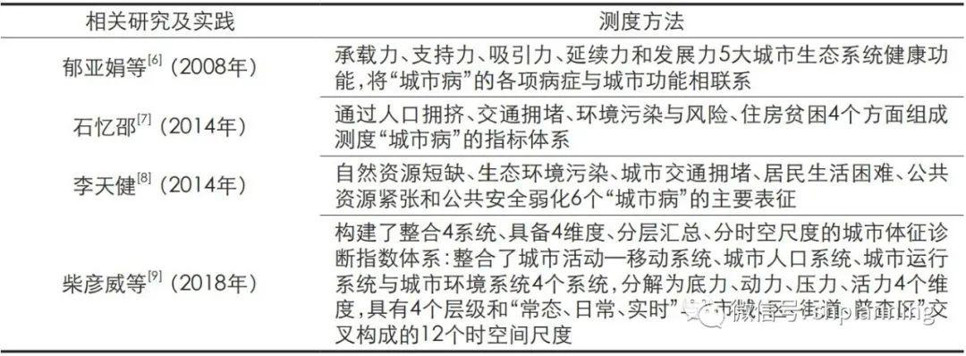 城市体检指标体系评估通过建立城市通用的一级、二级指标并设定相应的标准,对城市人居环境规划建设管理工作的各个领域进行系统性、常态化和周期性的评估。通过评估列出整治问题的任务清单、责任清单,不断校核城市发展建设目标与任务,并对人居环境改善与成效等进行定期评估和反馈,城市政府依据体检评估结果来科学决策和施策。城市健康程度的评估主流基于还原论思想,将城市系统分解成几个子系统,通过子系统统计指标的组合得到城市的总体健康程度,下表列出了近年来相关的研究工作进展。
