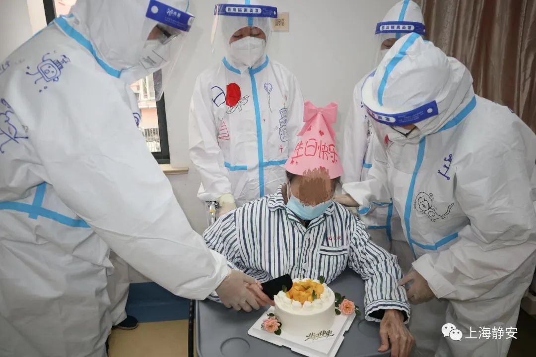 这个特殊的生日,李奶奶面前不仅有甜甜的生日蛋糕,身边还有“大白”特地在防护服上手绘的爱心寿桃,暖暖的爱意洋溢在病房中。