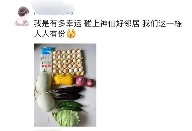 原来,这位“神仙好邻居”是同住这栋楼的夏先生。夏先生了解到不少邻居最近食物储备有些不足,就自发订购了20份食物礼包,免费送给了同栋楼的所有邻居。“没什么,都是左邻右舍的,能帮一点是一点。”夏先生表示。