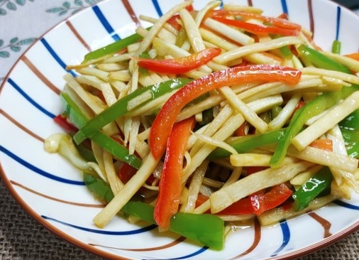 用料:茭白、青椒、红菜椒、盐、蚝油、生抽