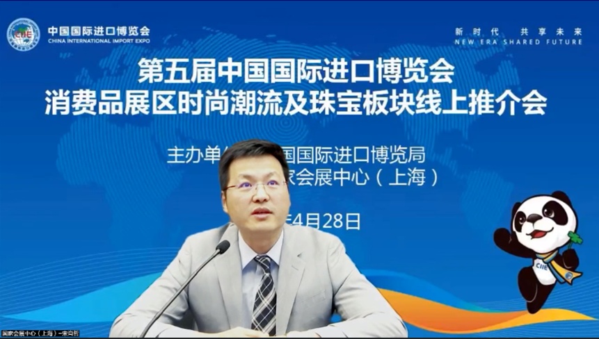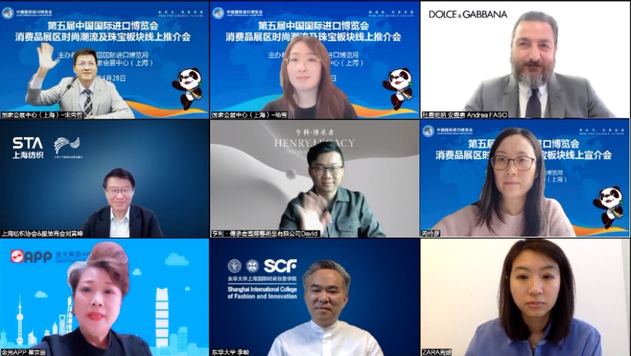 4月28日,第五届进博会消费品展区时尚潮流及珠宝板块线上推介会成功举办。国家会展中心(上海)总裁助理宋尚哲,上海纺织协会、上海市工商联纺织服装商会常务副会长兼秘书长刘寅峰出席并致辞,东华大学上海国际时尚创意学院院长李峻,泰佩思琦亚太区总裁杨葆焱、杜嘉班纳亚太区高级副总裁安嘉勇、金光集团APP(中国)副总裁翟京丽、艺术家陈世英线上出席活动并发言。50余家国外知名时尚企业代表、合作伙伴及媒体代表线上参会。