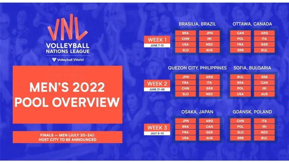 由于疫情原因,中国男排曾主动退出2021年世界排球联赛。根据VNL现有赛程,中国队此番将在6月7日至12日首先亮相巴西利亚(巴西)站,然后于6月21日至26日参加奎松(菲律宾)站,紧接着于7月5日至10日参加格但斯克(波兰)站。