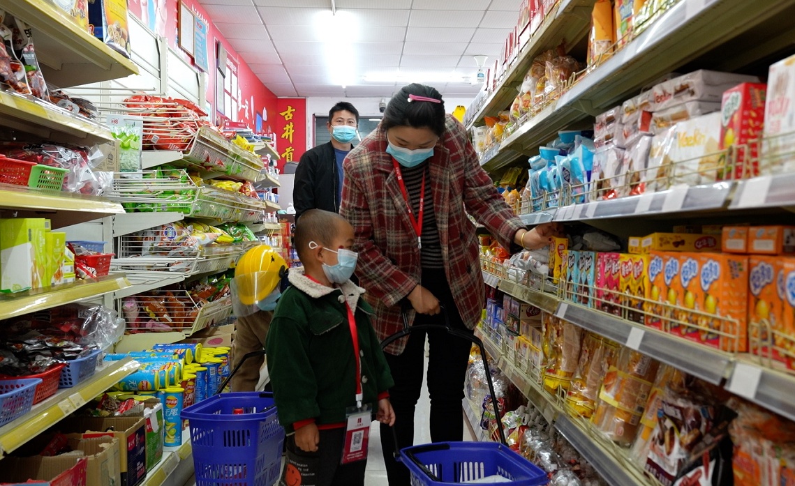 扫码测温、分发凭证、严控人流,为了进一步把牢防疫关,新村乡京东便利店内外划分了三个区域,使人员、秩序更加可控、可管。等候区内,居民手里拿着的五色购物卡大有讲究,据介绍,为了严格控制店内的人员数量,每隔一小时分发给居民的购物凭证就会换一种颜色,由于该便利超市规模较小,所以同一时段店内总人数控制在5—10人左右,以精细化的手段实现了疫情防控下超市的有限有序开放。