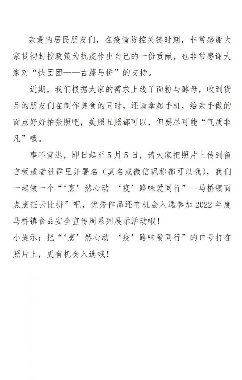 居民在“快团团——古藤马桥电商平台”或者各居委配菜群就可投稿面点作品,优秀作品还有机会入选参加2022年度马桥镇食品安全宣传周系列展示活动。