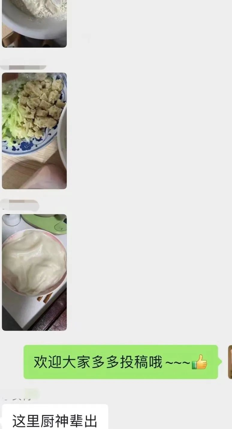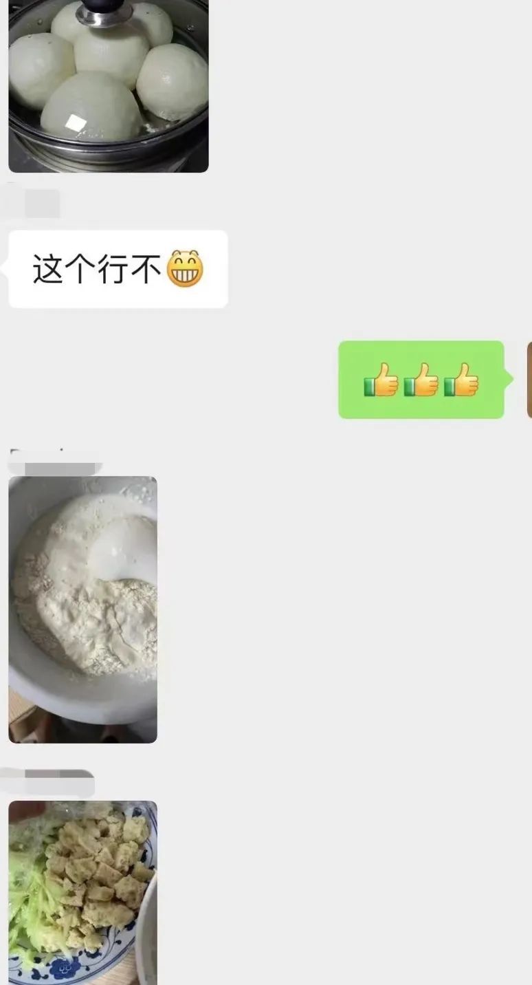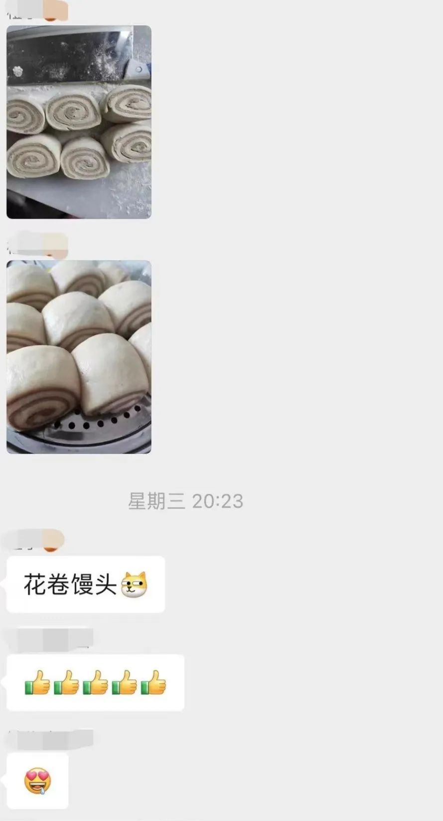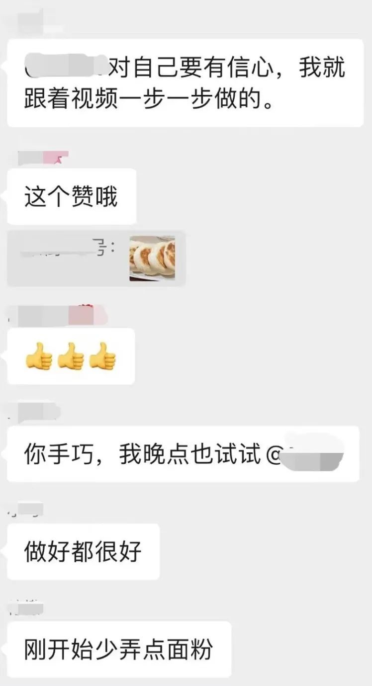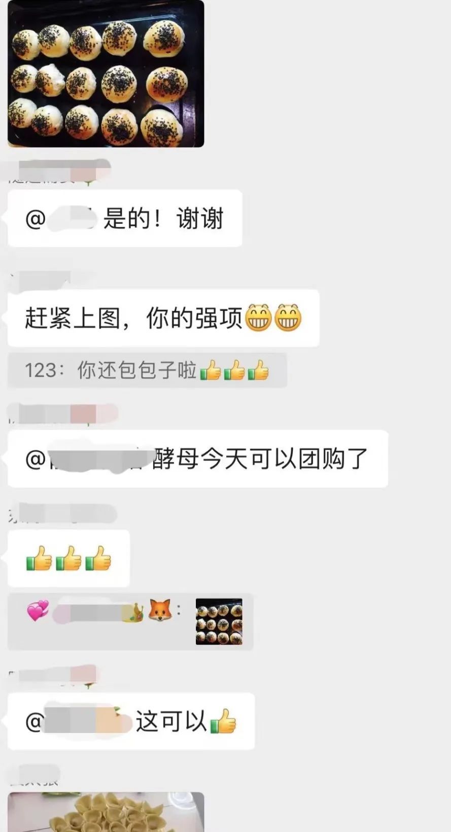 在业主群里,除了左邻右舍的纷纷点赞,邻居间彼此交流、以厨会友的讨论也不少。“你这个螃蟹形状包子好可爱,有没有教程”“我发现中筋面粉也可以做面包!”“面条加菠菜汁可以做成绿色面条,喜欢的可以试试”……