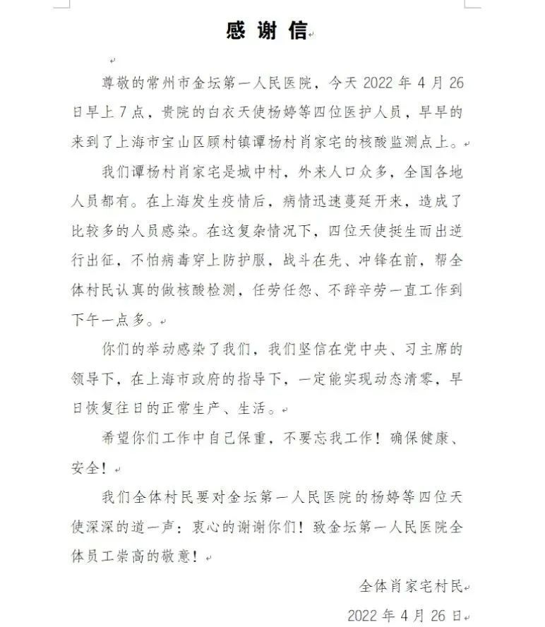 4月26日,来自江苏省常州市金坛第一人民医院的医护人员,在宝山区顾村镇谭杨村2个核酸检测点,从早上7时一直忙碌到下午1时。“‘大白’不吃饭、不休息,只为按时完成3000余人次的核酸检测采样。”据了解,感谢信是做完核酸后,村民们有感而发所写的。一封感谢信,也是一剂“暖心贴”。
