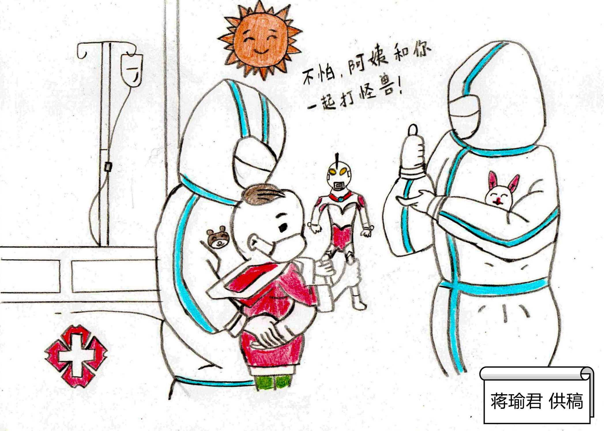 “晓韫一直都是女儿最大的骄傲。我特别为晓韫画这幅志愿者速写,就是想告诉女儿,她的妈妈是保护大家的志愿者‘大白’,正是有千万个志愿者的辛勤付出,才有我们疫情之下的正常生活。”在“乘风破浪,逆行守‘沪’”篇章中,一幅名为《我的Super Wife》的速写尤其引人注目。画中的女子身穿防护服,戴着护目镜,眼神坚定,传递出必胜的信念。她就是静投集团“静·爱”号方舱运维团队后勤保障组成员王晓韫。画作的作者是王晓韫的爱人刘桀。他告诉记者,疫情初期,王晓韫就一直忙碌在社区防疫志愿岗位上。静投集团开始运维方舱后,居家办公的王晓韫更忙了,几乎24小时待命,微信“滴滴”声不断,全力配合做好各类必需品采买工作。为了鼓励和支持她,我就想到了用自己的专长,为她画一幅画,记录下她在抗疫中最美的样子,“她是我们全家的英雄。”
