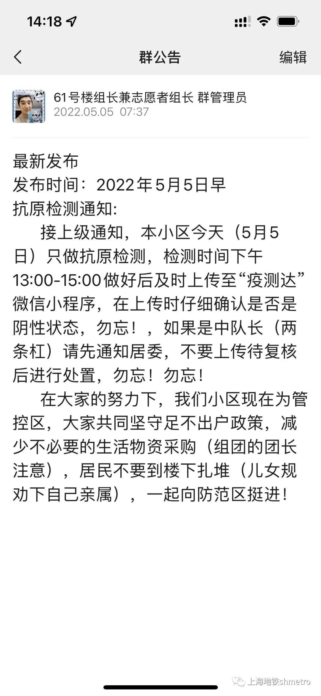 “接上级通知,本小区今天(5月5日)只做抗原检测,请及时上传至疫测达微信小程序。”