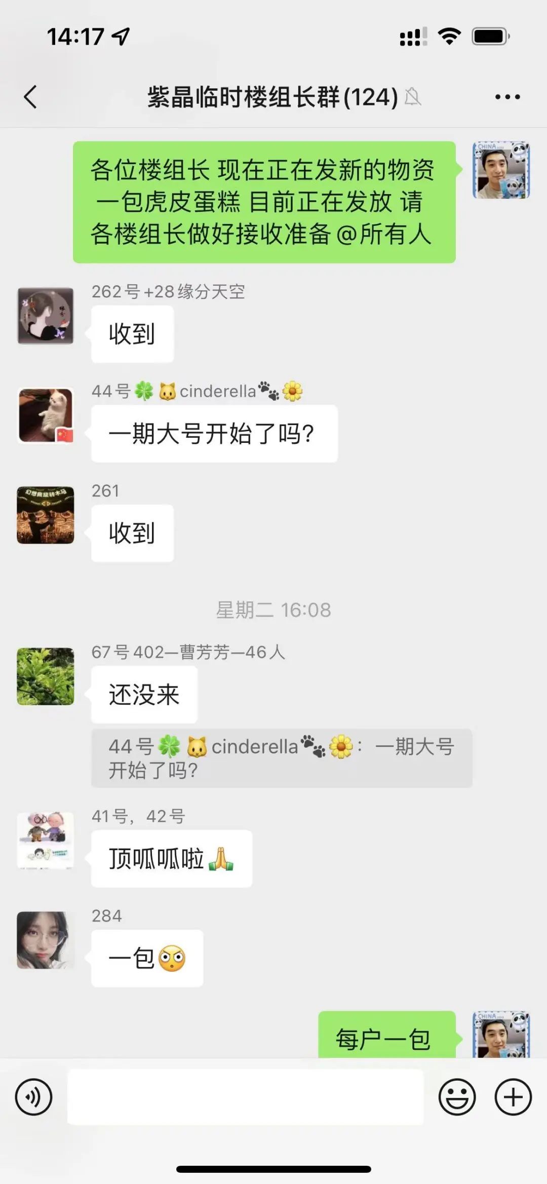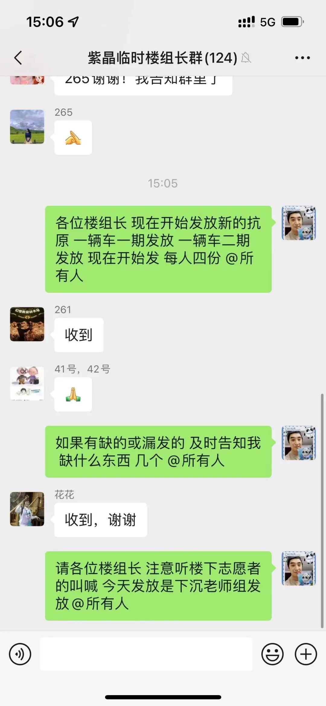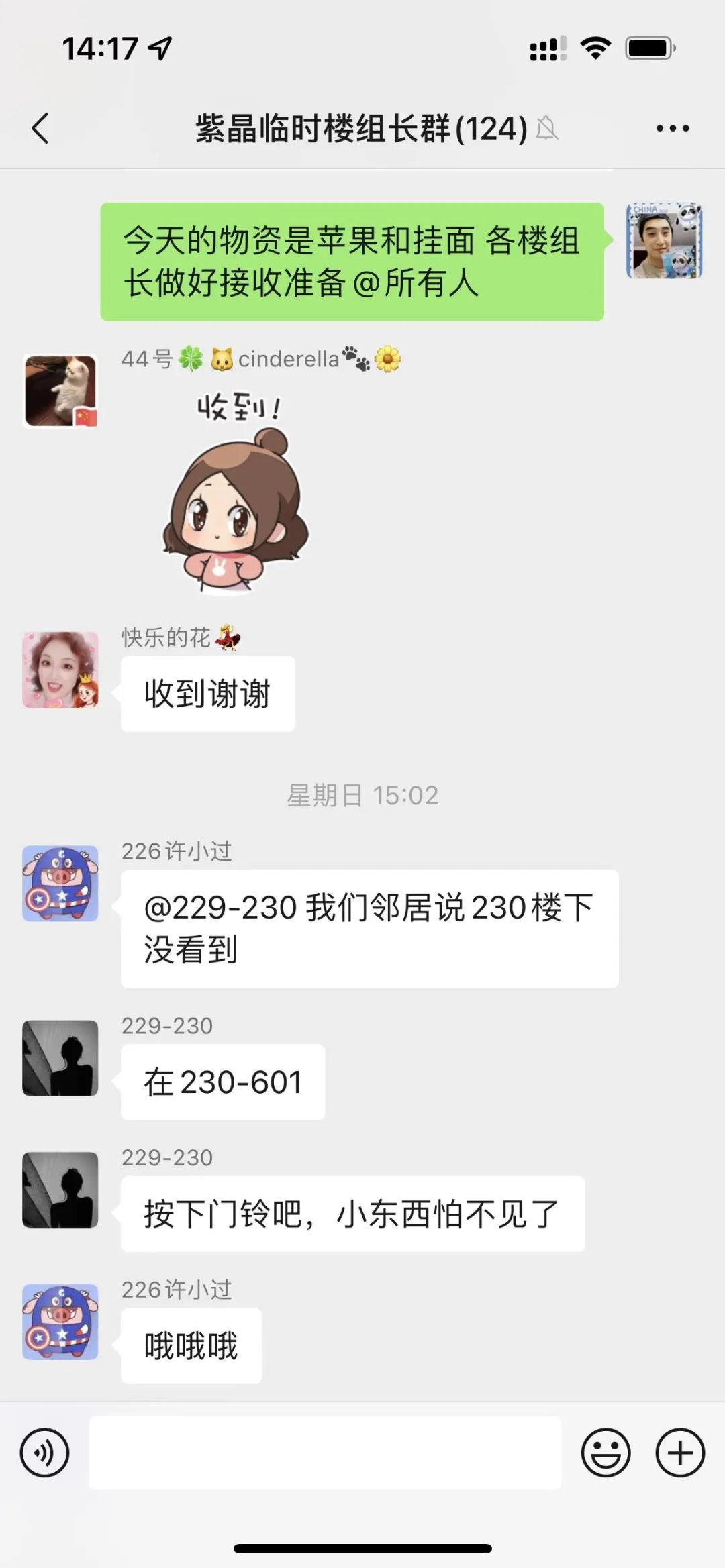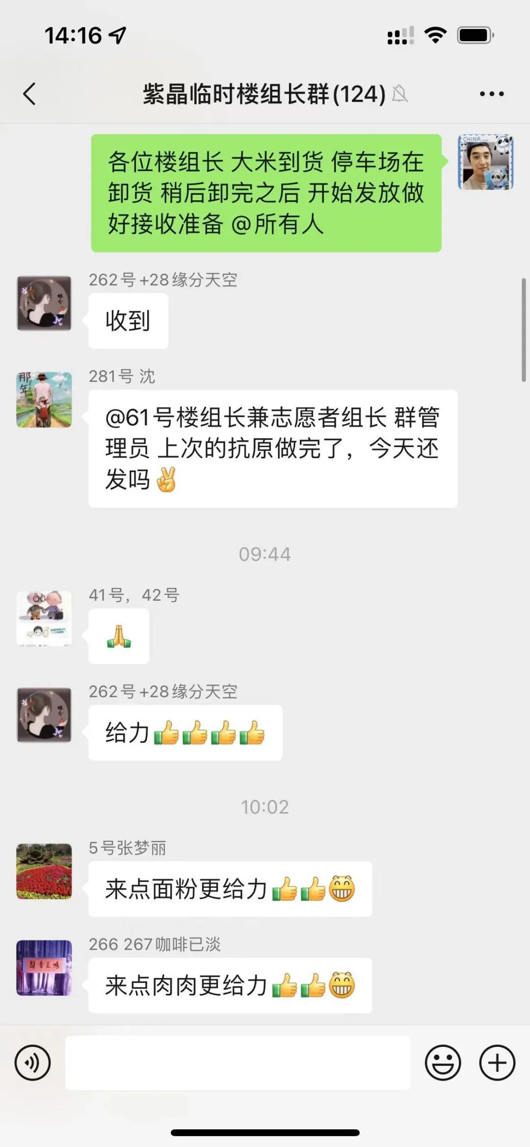 “各位楼组长,大米到货,停车场在卸货,稍后开始发放,做好接收准备。”