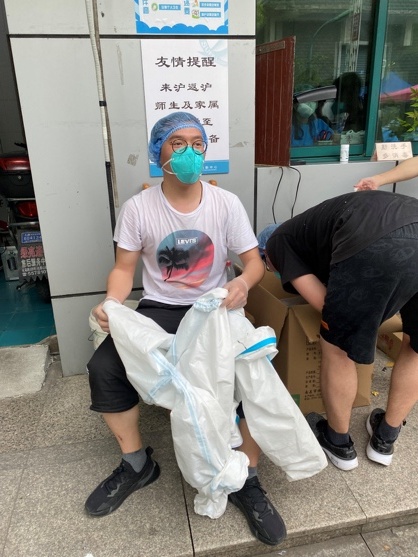 沈霄豪同学在三门路园区封闭后主动联系老师希望参与志愿服务,在得到批准后他义无反顾地加入了进来。当问到他为什么加入到园区的志愿者中时,他坦言:“同曹老师在推文中写到的一样,我是一名上财学生,也是硕士生支部的书记,上财就是我们的家,也是我们的‘战场’,上战场不需要什么理由,不上战场我想才需要。”