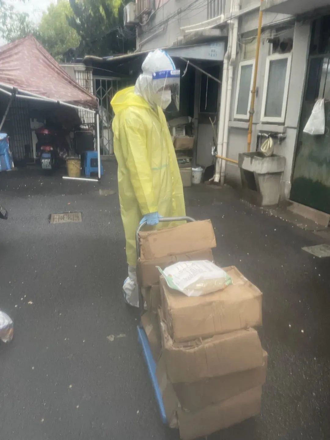 物资包经常在离小区200多米远的武川路222弄装卸,电瓶车、小推车、黄鱼车,方国强和组员们,以及居委干部张越把能想到的、能借到的工具都用上了,但每次还是需要来回至少三次。最近“运力”最强的黄鱼车故障了,一时又无法修理,组员们来回的次数更多了……