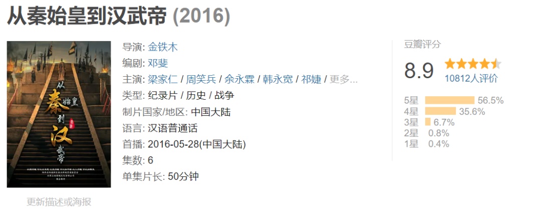 纪录片《从秦始皇到汉武帝》以最新的考古研究成果为切入点,以展现中华文明青春期最优秀的气质为目的,将汇聚电视、电影、以及历史文献的各种亮点元素、艺术手法,体现上造影视“用电影思维,打造高端纪录片”的宗旨,是一部受众群体广泛的历史纪录片。