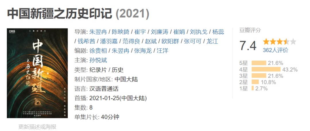 纪录片《中国新疆之历史印记》通过有力的历史真相,展现中华文明脉络,深刻再现中国新疆地区数千年历史演进与各民族交往交流交融、多种文化融合互通,向今天的观众呈现出一个既雄浑又亲切,既悠久又现代,既美丽又多彩的中国历史画卷。