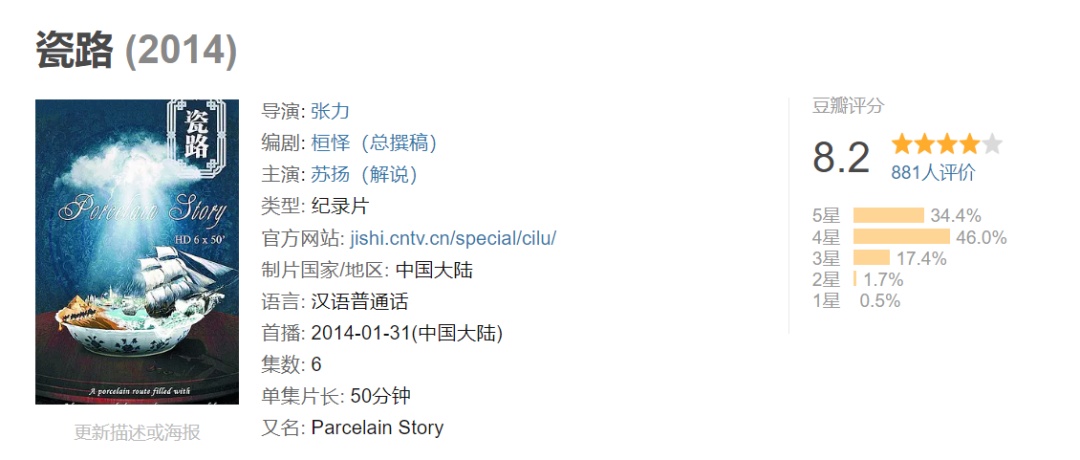 纪录片《瓷路》全片共分为六集,每集 50分钟,在这条神奇的瓷器之路上,充满了 探险、财富、人性、生死、战争和沉船的精 彩故事,从中可以寻找中国文明和世界文明 交流碰撞的火花。
