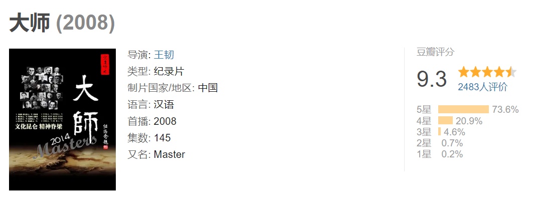 百集文化系列片《大师》是上海文广传媒集团纪实频道以栏目形式打造的一个电视文化工程,是今人重读中国近现代史的一个构想,是我们与观众共同走近“大师”、感受伟大的一种尝试,是用敬畏和自信来打造艺术精品的一种努力。
