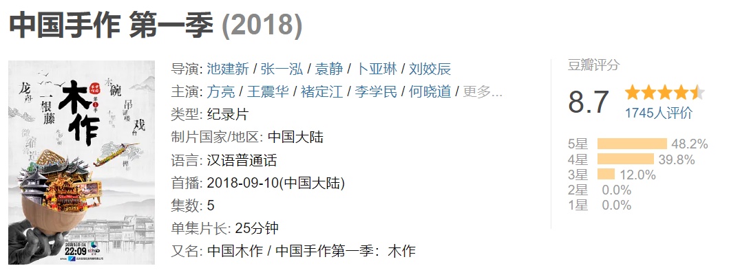 第一季《手作》共5集,每集25分钟,选取的手艺人也都是普通木匠或由木匠发展出来的匠人,通过“他们”和木作工艺,表现工匠精神、让人们看到木作之美、了解中国人与木头之间的情感和故事。