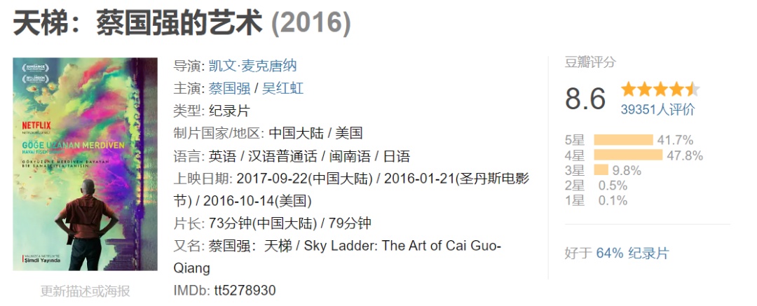 《天梯:蔡国强的艺术》是当今世界最重要艺术家之一蔡国强的首部电影纪录片。既是一个从中国出发、成为具国际影响力艺术家的励志故事,也体现着新时代中国人的追求和精神。