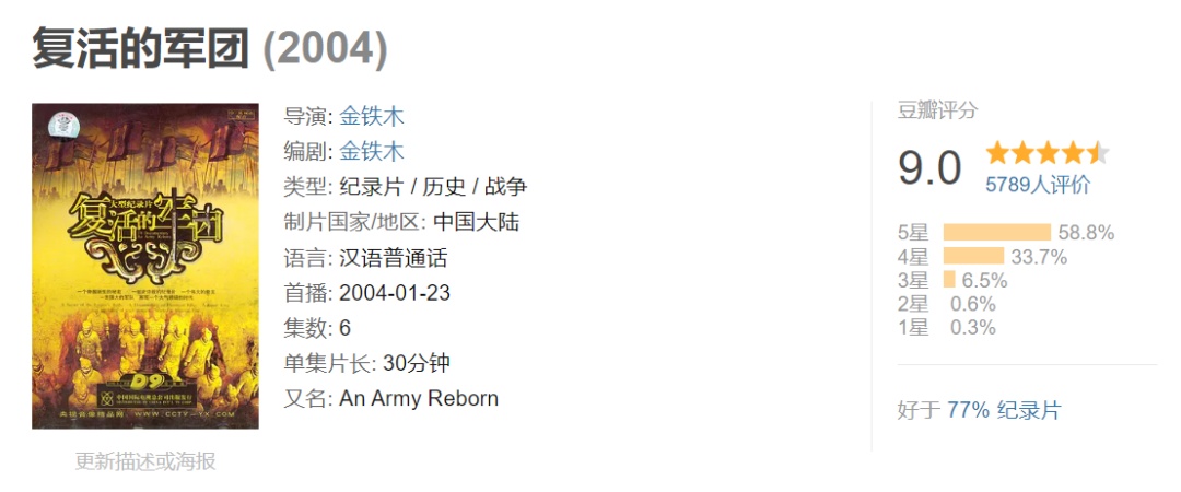 纪录片分“王者之师”“血色青铜”“生死之地”“关山飞渡”“举国之战”“与子同仇”六集,共三小时,展示了秦军团的昔日荣光。