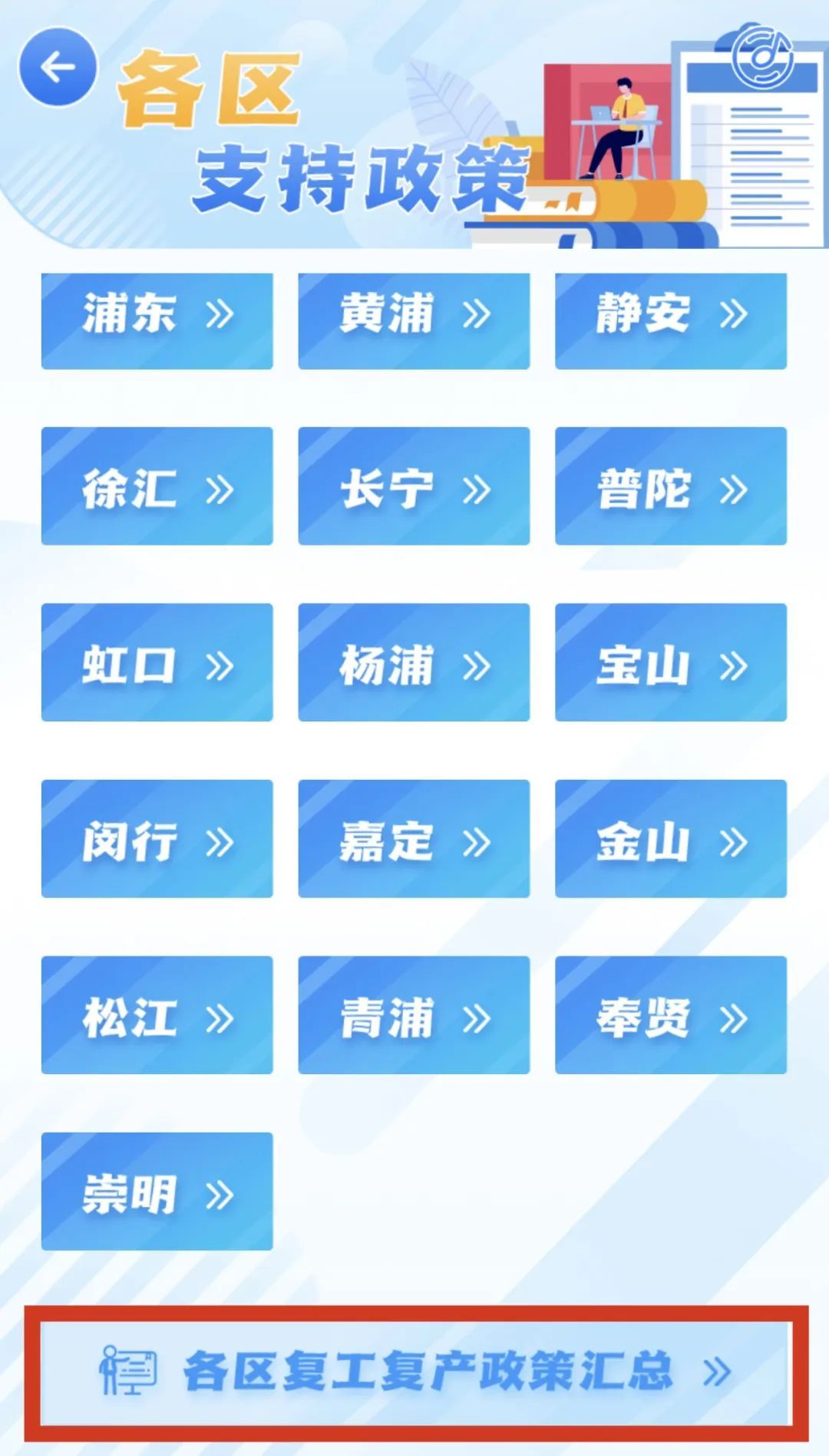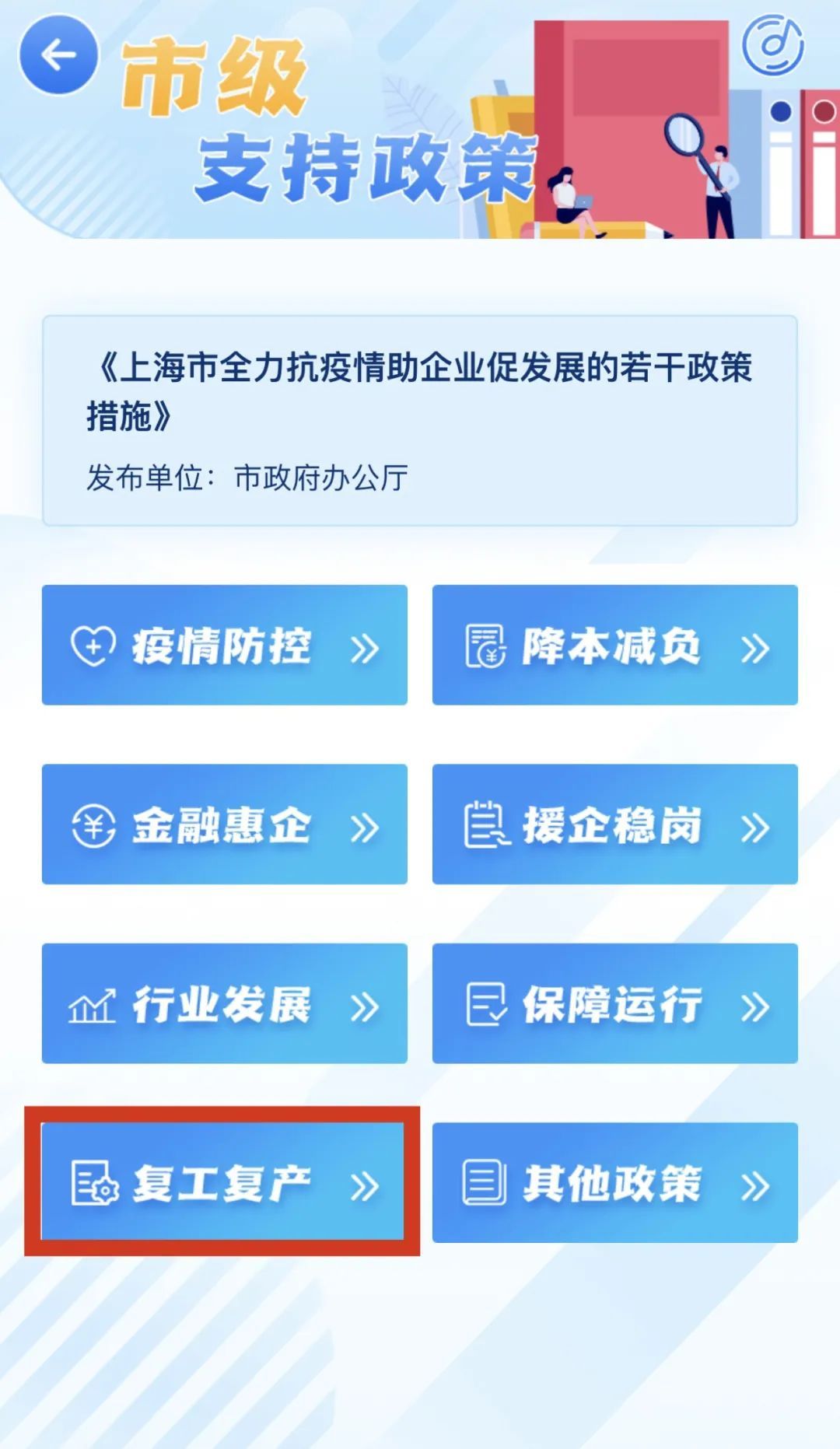为协助企业做好复工复产工作,快速了解相关政策细则,我们在市区支持政策原有分类的基础上,新增“复工复产”类别。