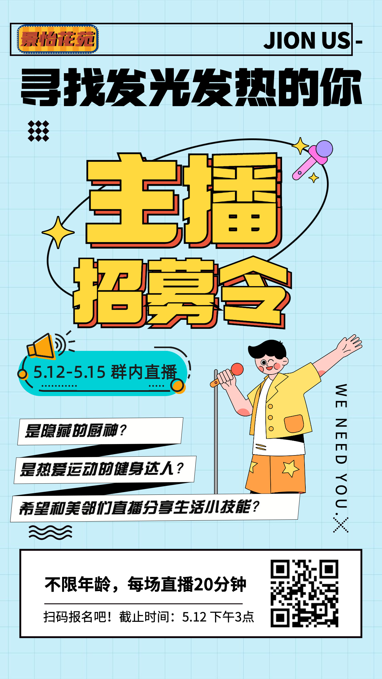 “谁当主播?”“社区居民各展所长即可。”“直播什么?”“疫情防控、健身锻炼、生活技能、亲子游戏等都可以,尽量覆盖不同群体。”12日一大早,宣传组经过一番深入讨论,一张主题为“寻找发光发热的你”的主播招募令电子海报随即诞生。