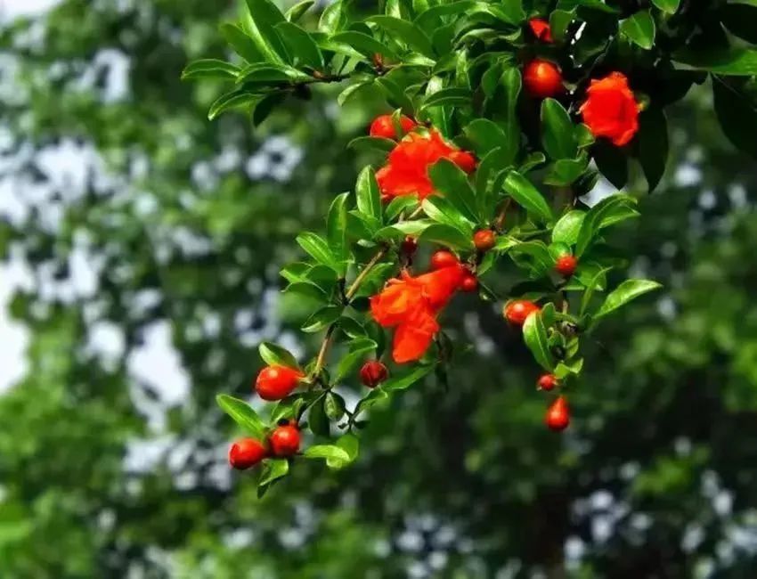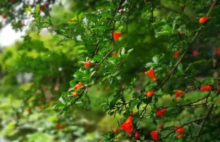 厚重的花萼上,折叠着丝绸般轻柔的花瓣,好似一个个红色小喇叭,点缀在秀气精致的翠叶间。在醉白池外园的荷花池畔、盆景园、车行道、池上草堂前,一树树盛开的石榴花将静谧的公园映衬得热闹缤纷。