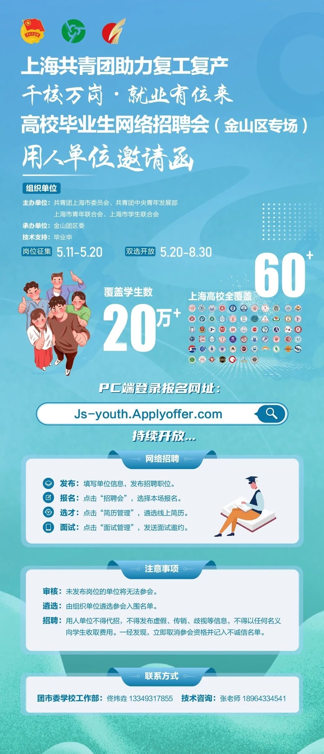 5月11-16日,金山区人社局与团区委共同组织开展“职在湾区·2022届高校毕业生专场”系列网络直播带岗活动,包括云宣讲、云服务、云招聘等内容。