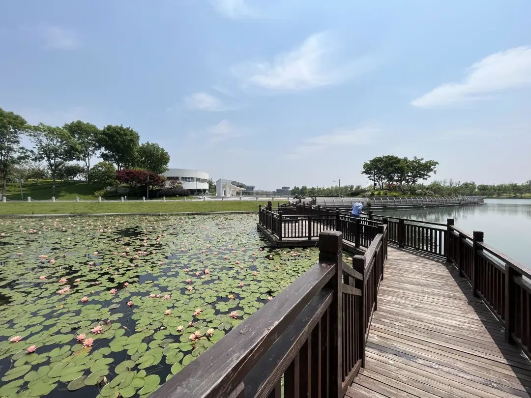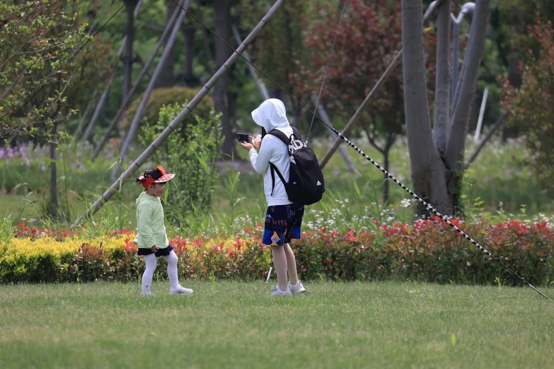 而在上海之鱼,明媚的阳光下繁花盛开,波光粼粼的金海湖畔,陆续有家长们带着宝宝前来游园,呼吸新鲜空气。虽然目前公园内的室内场馆及游乐设施等暂不开放,但是能够拥抱大自然已经让孩子们不亦乐乎了。