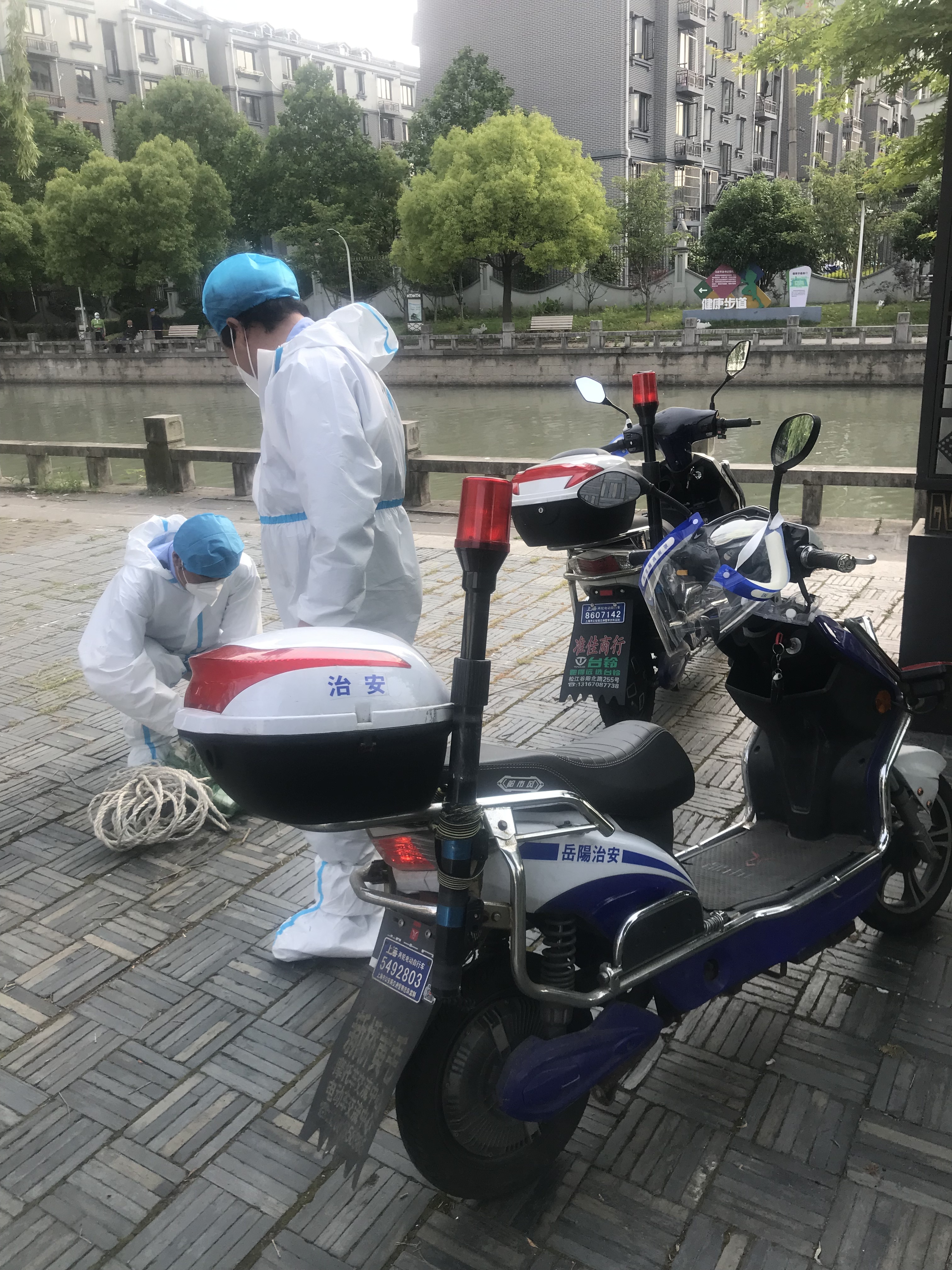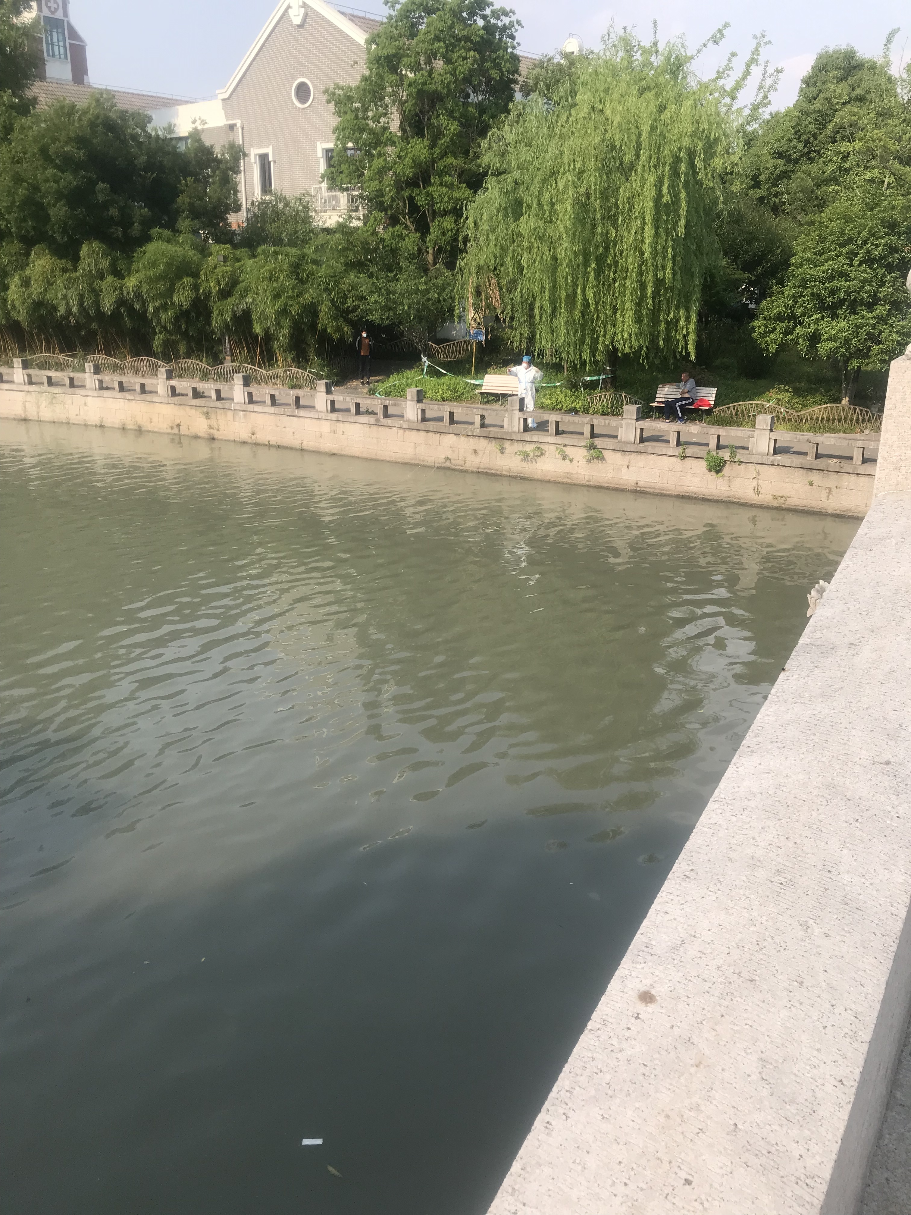 5月16日下午,与不少防范区居民一样,记者趁着好天气出门散步,途经思鲈园附近的一座桥时,看到不少居民正在垂钓,而一旁,有三两市民一直朝着河道指点、张望。记者上前发现,河道中央赫然横贯着一张渔网,两头分别用绳子栓在河道两侧护栏的石柱上。“是谁下的渔网?”不少市民彼此询问,但始终无人作答。