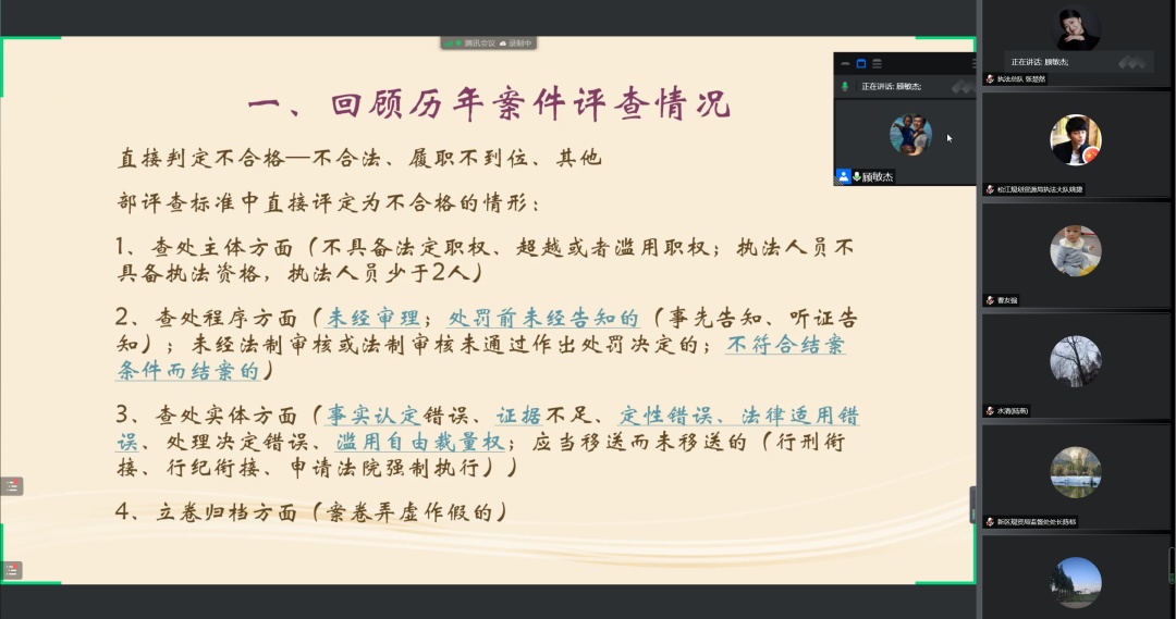 执法上水平,案卷是基础。着眼全面提高办案质量,局执法总队同志联系历年案件评查情况和本年度规划资源执法工作进展,深度解读案件审理工作有关内容及《土地违法案件询问笔录规范指引》、《上海市规划资源行政处罚执法文书通用样式及使用指南》,在理论结合实践的过程中,讲明案件办理的具体流程方法和重点注意事项。在此基础上,总队领导也结合一线执法经验,细致讲解案件办理的标准要求,帮助参训人员练好执法业务“基本功”、跑出执法创新“加速度”。