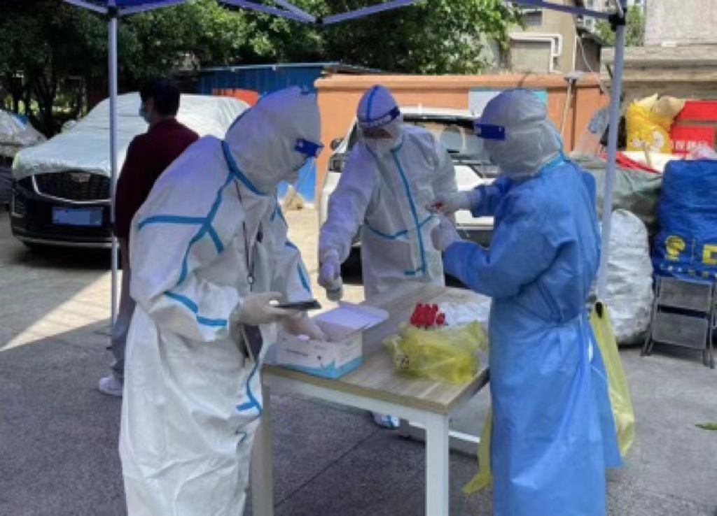 在支援的社区,每次核酸采样前,他早早地进行各项准备工作。采样开始后,有时他帮助居民扫码,有时他手持喷壶对采样区域进行喷洒消杀,有时他在核酸检测的队伍中维护秩序。一场核酸下来,时间长达几个小时,他“大白”防护服里面的衣服都湿透了。