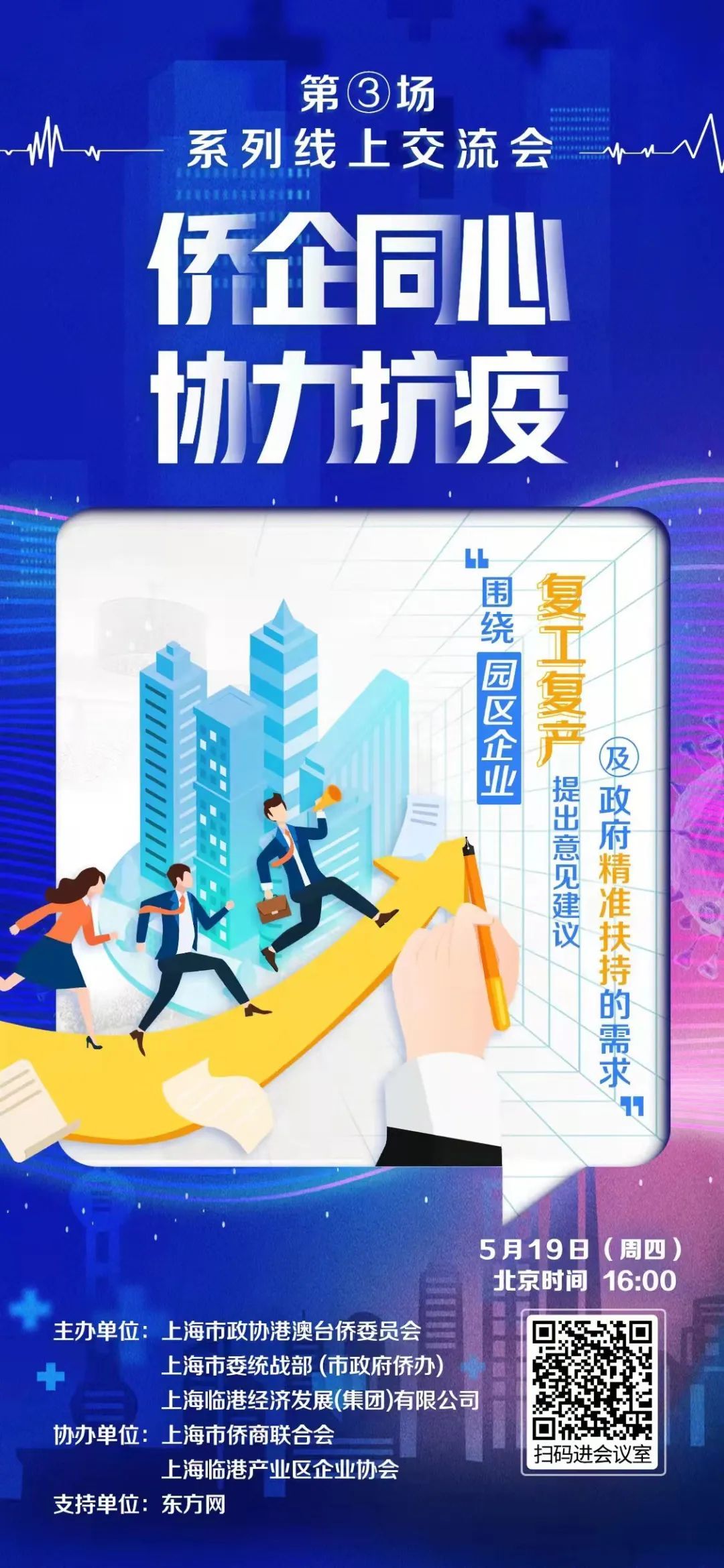 为助力推进疫情防控和复工复产工作,5月19日,上海市政协港澳台侨委员会、上海市委统战部(上海市政府侨办)联合主办“侨企同心 协力抗疫”第三场线上交流会。上海市委统战部副部长,上海市民族和宗教局党组书记、局长王珏出席并讲话。上海市政协港澳台侨委员会主任、市政府合作交流办主任姚海主持。