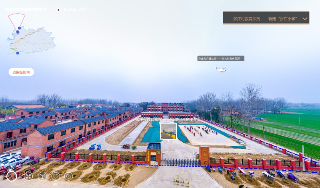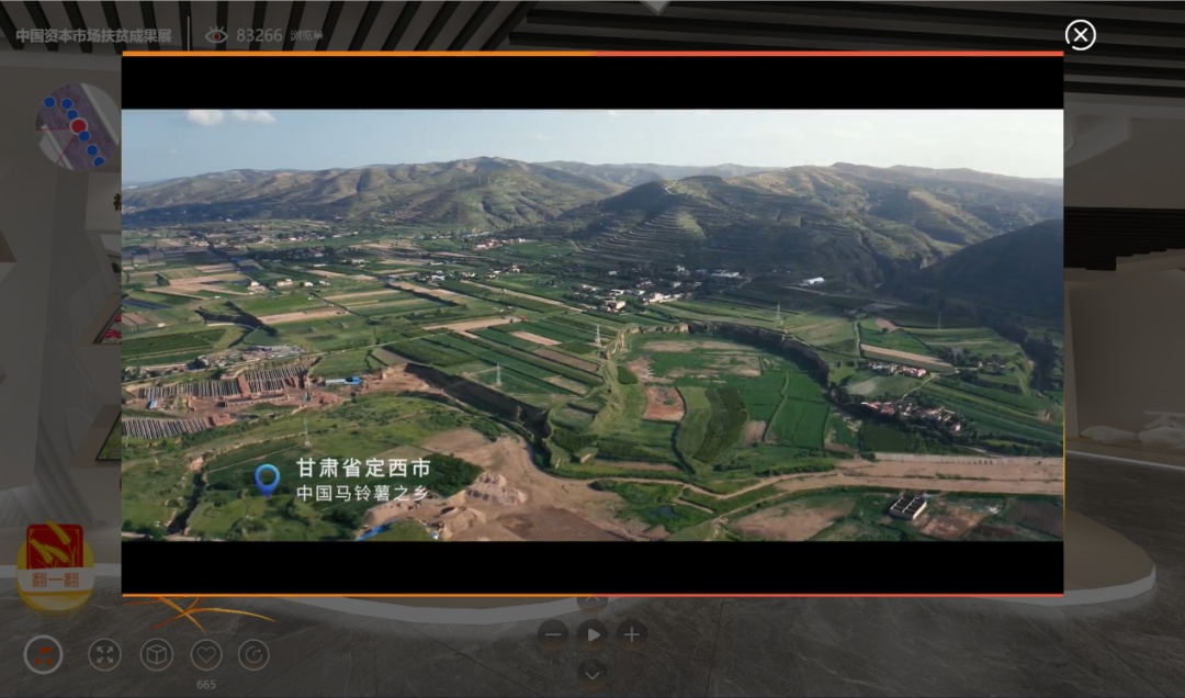 主要展示证监会系统定点帮扶的九个县取得的扶贫成果,包括河南省兰考县和桐柏县、山西省隰县和汾西县、安徽省宿松县和太湖县、甘肃省武山县、陕西省延长县以及新疆麦盖提县。观众可点击参观六所一司帮扶案例以及扶贫历年大数据。进入走廊区域,是展厅的互动展项“转一转•脱贫新貌”,点击两侧的水晶球可以观看九个定点扶贫县全景航拍照,了解当地特色扶贫项目,感受定点扶贫县新貌。