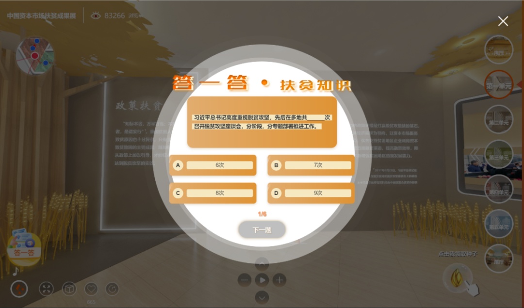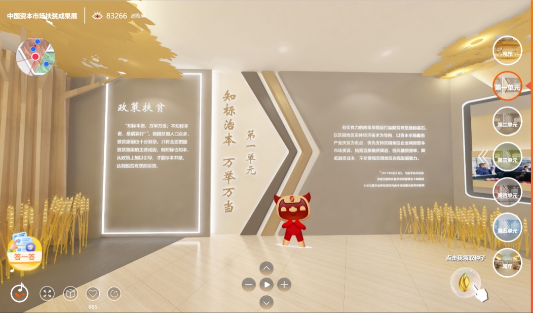 通过展示国家对扶贫工作进行的政策部署和颁布的指导文件,以及证监会历年扶贫工作总结及取得的荣誉成就,彰显扶贫大格局中顶层设计与规划的指导性作用。观众也可线上参与“答一答•扶贫知识”小游戏。