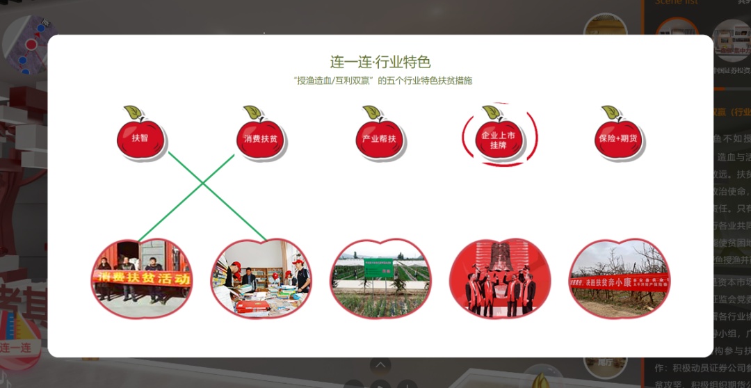 通过图文形式展示证券公司、期货公司、基金管理机构、上市公司等行业经营机构响应号召、踊跃参与,承担企业社会责任,积极投身扶贫工作所取得的成就。观众可参与“连一连•行业特色”互动游戏,通过将扶贫照片和对应的扶贫方式连线的小游戏,加深对行业扶贫的认识。