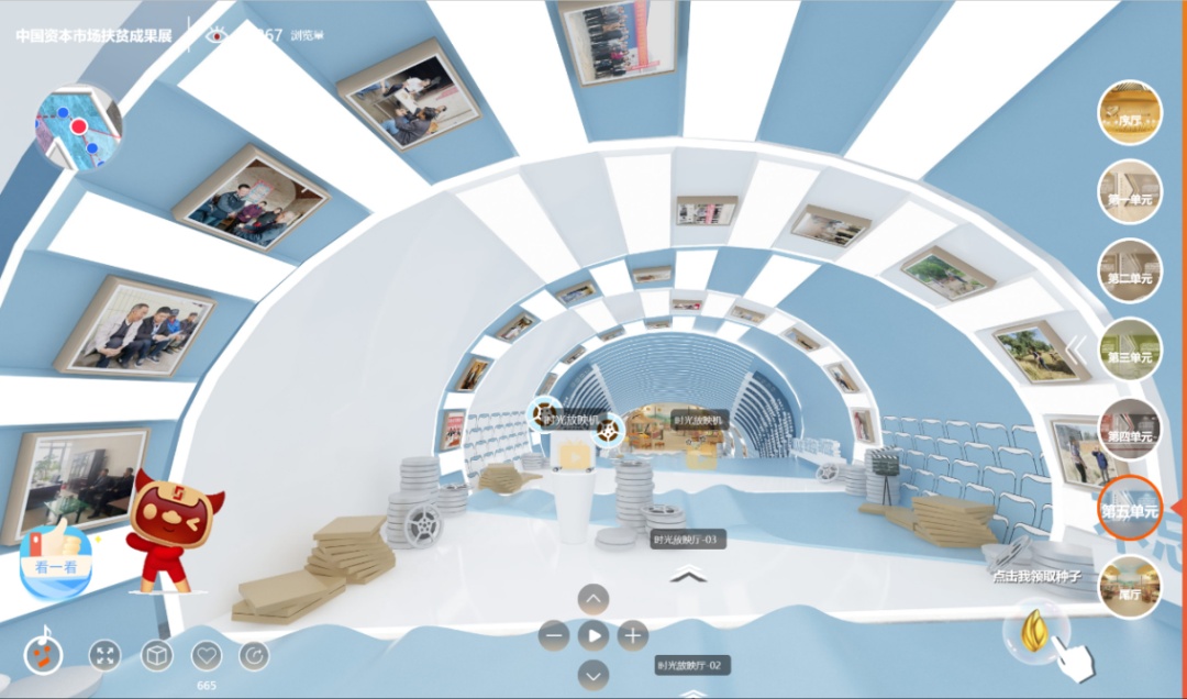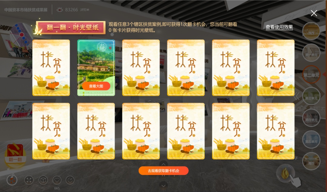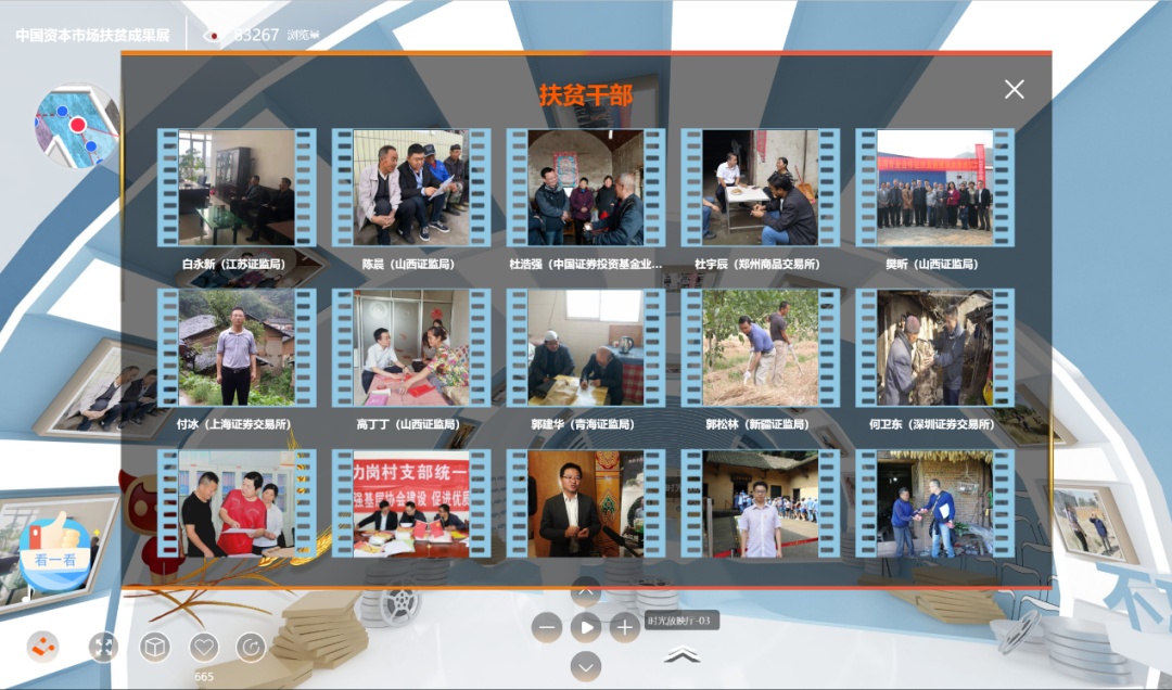 展现了各证监局立足辖区实际,借助资本市场力量,通过产业扶贫、教育扶贫、公益扶贫、消费扶贫、资本扶贫、党建扶贫等多种手段,为扶贫工作所作出的贡献。展厅内藏有设置“翻一翻•时光壁纸”卡片抽取互动展项,卡片图案来自于证监会系统内各单位与行业力量扶贫历程中的动人瞬间。点击并观览各地证监局扶贫举措,将有机会抽取扶贫卡片。