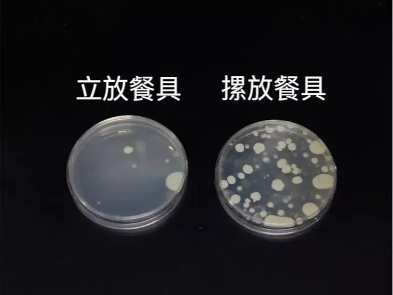 三天后对比显示,立着放的餐具菌落总数为8000cfu/套,符合我国相关卫生标准,而摞着放的参加细菌数量是560000cfu/套,为立着放的70倍。