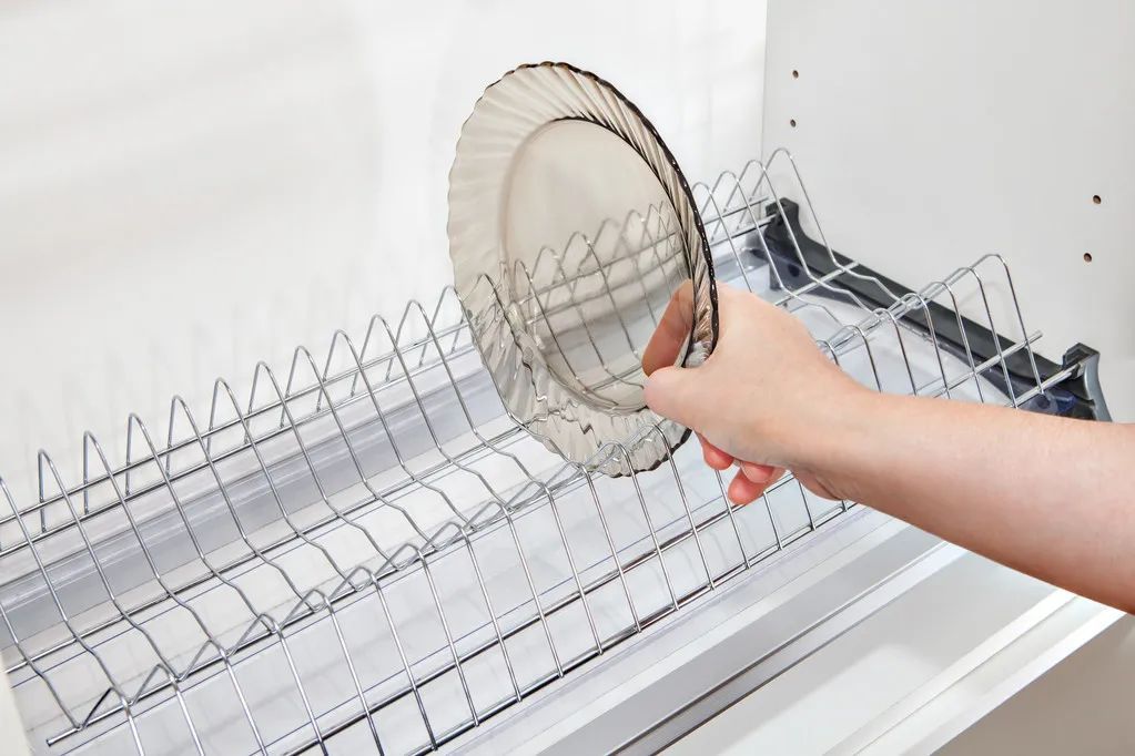 待餐具表面没有水滴后,再将其放入橱柜中存储,以免落灰。类似的其他餐具,如锅铲、筷子、砧板等,也建议立着放于可沥水的置物架上。